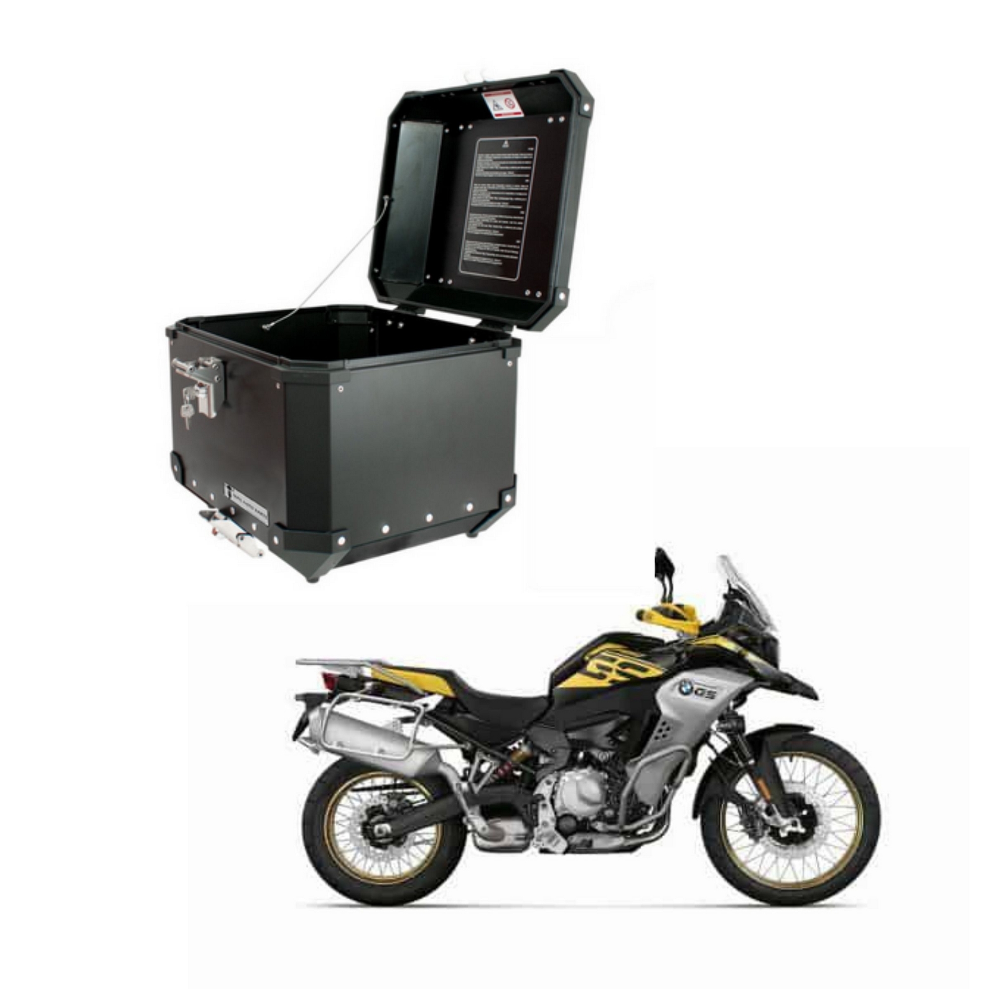 Nesta oferta estão inclusos um (1) Top Case na cor preta e um Kit de suportes para F850GS ADVENTURE.