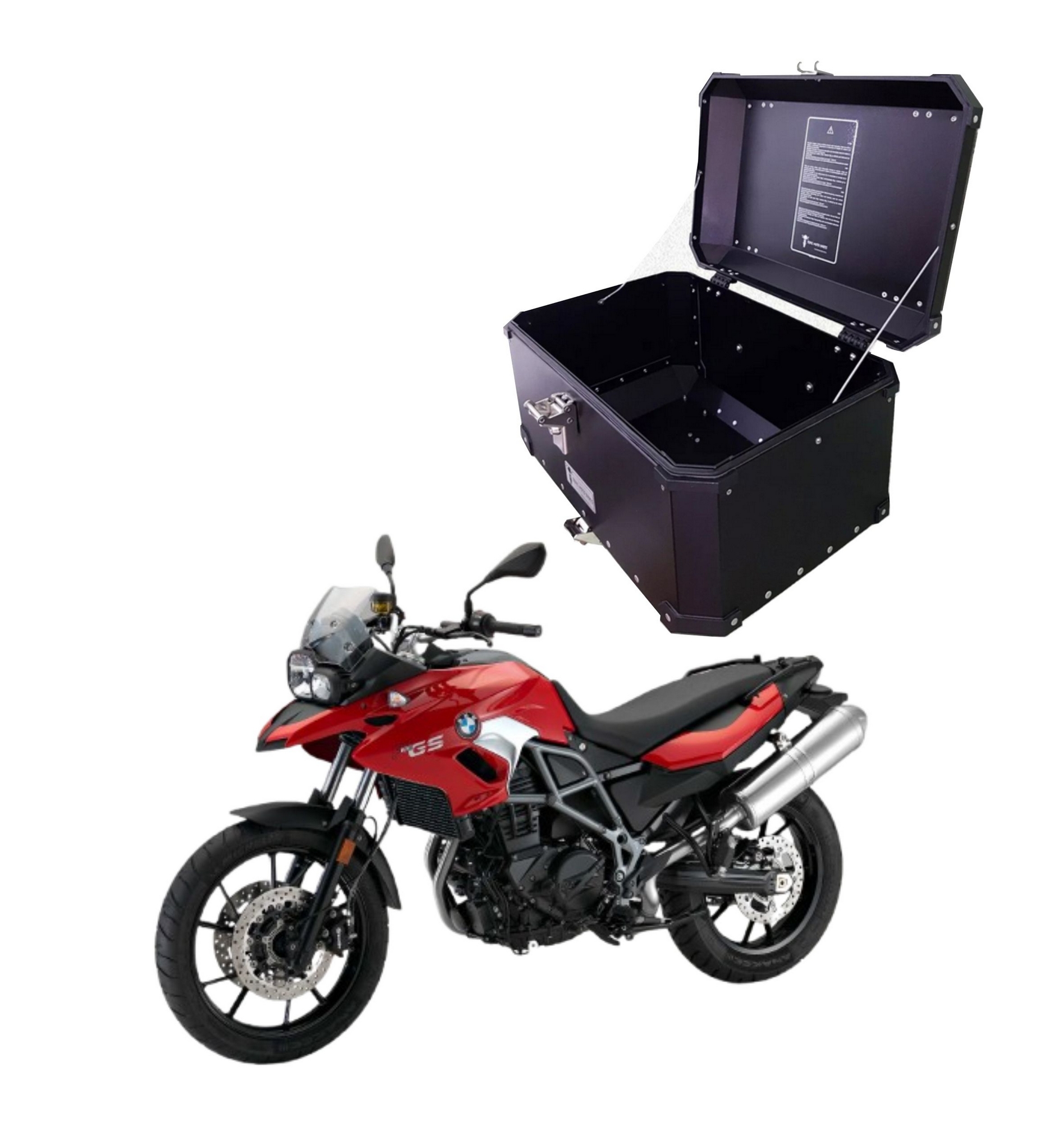 Nesta oferta estão inclusos um (1) Top Case na cor preta de 56L e um Kit de suportes para BMW F700GS.